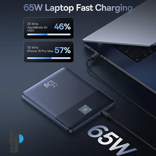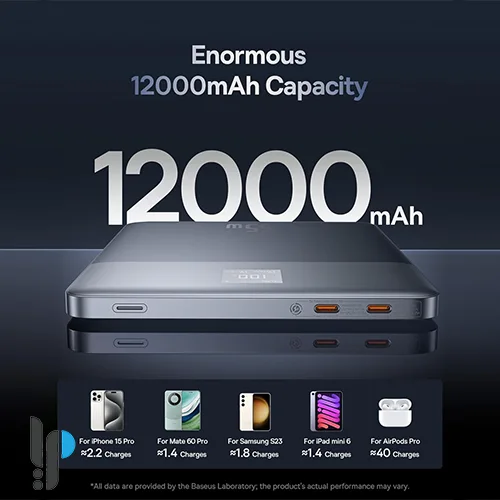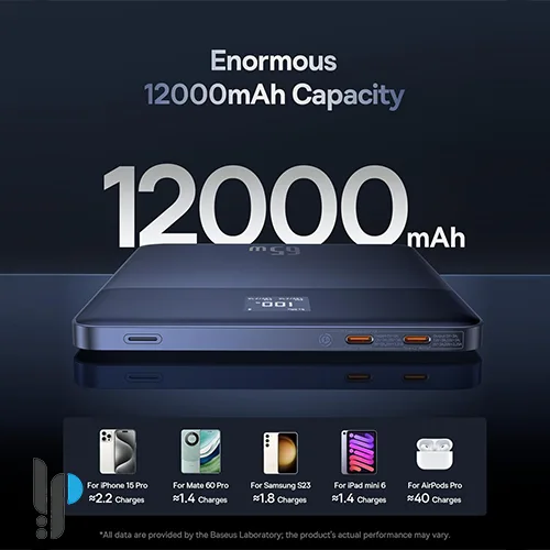 ظرفیت 12000 میلیآمپری این محصول بهخوبی پاسخگوی نیازهای روزمره کاربران است. با وجود ظرفیت نهچندان بالا نسبت به برخی پاوربانکهای حجیمتر، توان 65 واتی این دستگاه جبرانکنندهای قدرتمند برای زمان شارژ محسوب میشود. شما میتوانید یک لپتاپ با ورودی Type-C را نیز با سرعت بالا شارژ کنید، چه برسد به تلفن همراه یا تبلت.